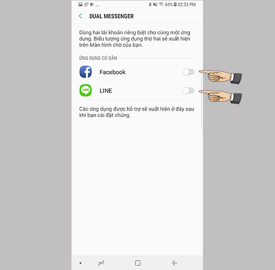 Bước 2: bật những áp dụng bạn muốn dùng 2 account.